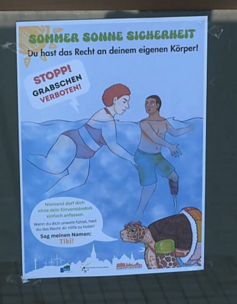 Auch in Büren greift man dieses Jahr auf kreative Abbildungen zurück, um sexuelle Belästigungen im Freibad zu verhindern, und setzt noch einen oben drauf. So zeigt eines der Plakate etwa einen dunkelhäutigen Mann mit Beinprothese, der in einem Schwimmbecken von einer korpulenten weissen rothaarigen Frau unsittlich am Hintern berührt wird. Darunter eine Schildkröte mit Schwimmflügeln und Rettungsring um den Panzer, die sagt: «Niemand darf dich ohne dein Einverständnis einfach anfassen. Wenn du dich unwohl fühlst, hast du das Recht, dir Hilfe zu holen! Sag meinen Namen: Tiki!» Überschrieben ist das Plakat mit «Sommer Sonne Sicherheit. Du hast das Recht auf deinen eigenen Körper!».