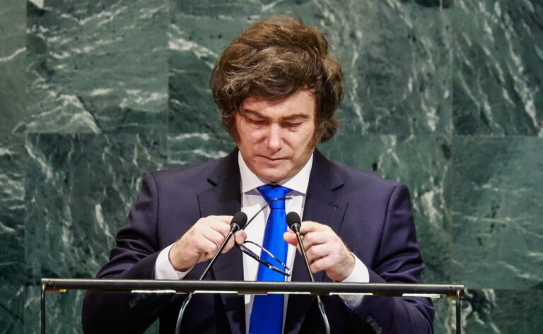 epa12402301 President of Argentina Javier Gerardo Milei speaks during the General Debate of the 80th session of the United Nations General Assembly (UNGA) at the United Nations headquarters in New York, USA, 24 September 2025
