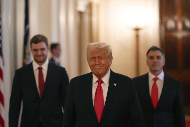 President Donald Trump arrives with Aleksander Barkov, left, and owner Vincent Viola to speak during a ceremony with the Florida Panthers NHL hockey team to celebrate their 2024 Stanley Cup victory in the East Room of the the White House, Monday, Feb