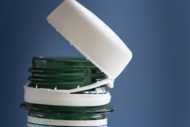 Eine offene PET-Flasche mit am Flaschenhals befestigtem Deckel, was Abfall und Littering eindaemmen soll, fotografiert am Donnerstag, 4