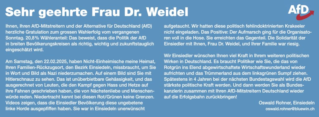 Rohner kritisiert den Aufmarsch mit markigen Worten: «Am Samstag, den 22.02.2025, haben Nicht-Einheimische meine Heimat, Ihren Familienrückzugsort, den Bezirk Einsiedeln, missbraucht, um Sie (Alice Weidel) in Wort und Bild als Nazi niederzumachen. Auf einem Bild sind Sie mit Hitlerschnauz zu sehen. Das ist unüberbietbare Gehässigkeit, und das ausgerechnet von Leuten, die den Kampf gegen Hass und Hetze auf ihre Fahnen geschrieben haben, die von Nächstenliebe und Menschenwürde reden.»