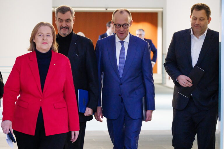 epa12584512 German Chancellor Friedrich Merz (2-R), German Finance Minister Lars Klingbeil (R), German Labour Minister Baerbel Bas (L), and Bavaria's State Premier Markus Soeder (2-L) arrive for a news conference after coalition talks in Berlin, Germany, 11 December 2025