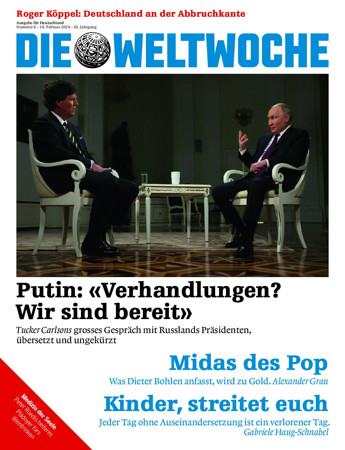 Wladimir Putin empfängt erstmals seit Kriegsausbruch einen westlichen Journalisten. Russlands Präsident sprach mit dem amerikanischen Medienunternehmer Tucker Carlson über die Geschichte seines Landes, das Zusammengehörigkeitsgefühl der slawischen Völker, die Rolle der Orthodoxie, die Beziehungen zum Westen und Wege zum Frieden in der Ukraine. Wir dokumentieren das zweistündige Gespräch übersetzt und ungekürzt.