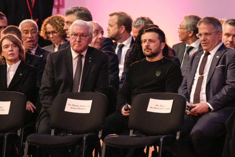 Ukrainian President Volodymyr Zelenskyy, center right, sits next to German President Frank-Walter Steinmeier, center left, at the Auschwitz-Birkenau former Nazi German concentration and extermination camp, during a ceremony marking the 80th anniversary of its liberation, in Oswiecim, Poland, Monday, Jan