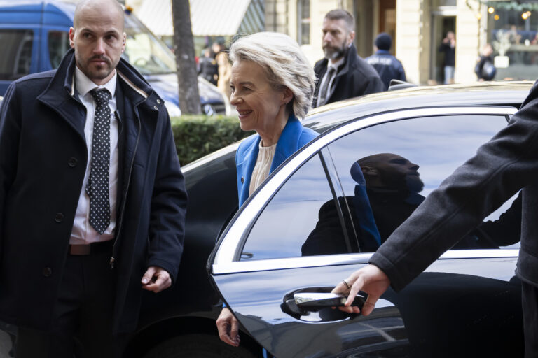 European Commission President Ursula von der Leyen gets out of a car before a bilateral meeting with Swiss Federal President Viola Amherd on Friday, December 20, 2024 in Bern, Switzerland