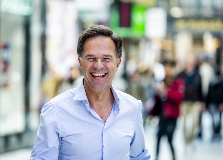 epa11391732 Outgoing Dutch Prime Minister Mark Rutte of the People's Party for Freedom and Democracy (VVD) campaigns for the European Parliament elections during a visit to the city center of The Hague, Netherlands, 05 June 2024