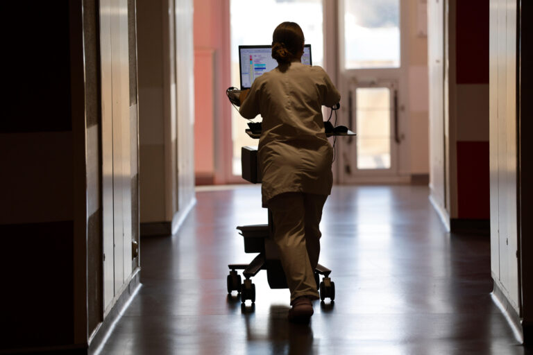 A nurse pushed a machine at the oncology care unit of the public hospital of Boulogne-sur-Mer, northern France, Thursday 20 Nov