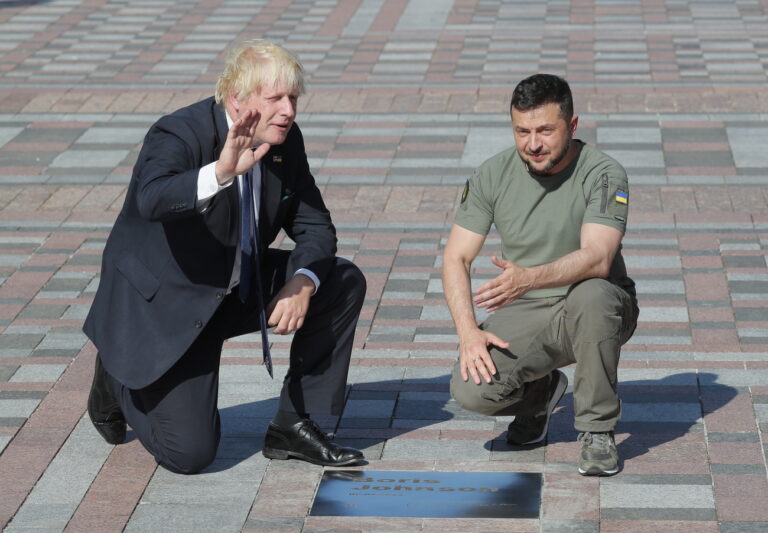epa10136489 Ukrainian President Volodymyr Zelensky (R) and British Prime Minister Boris Johnson (L) attend the inauguration of a plate with Johnson's name on the 'Walk of the Brave', dedicated to politicians who support Ukraine amid the Russian invasion, in Kyiv, Ukraine, 24 August 2022