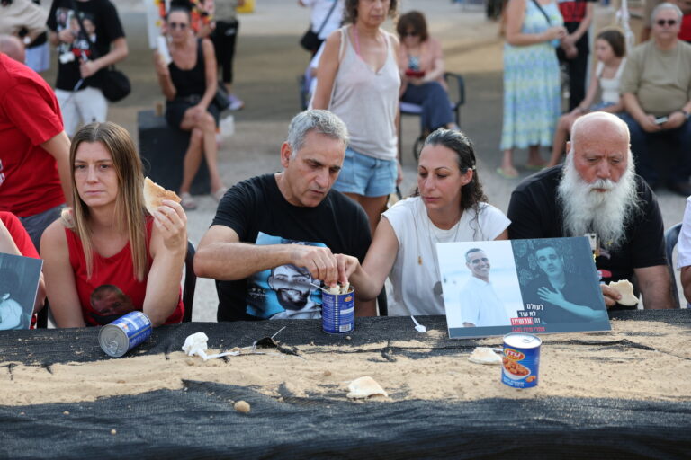 epa12291230 Families of Israeli hostages held by Hamas in Gaza sit at a diner table with canned beans and a piece of bread during calling the government to sign a hostages release and ceasefire deal, outside the Kirya military headquarters in Tel Aviv, Israel, 09 August 2025