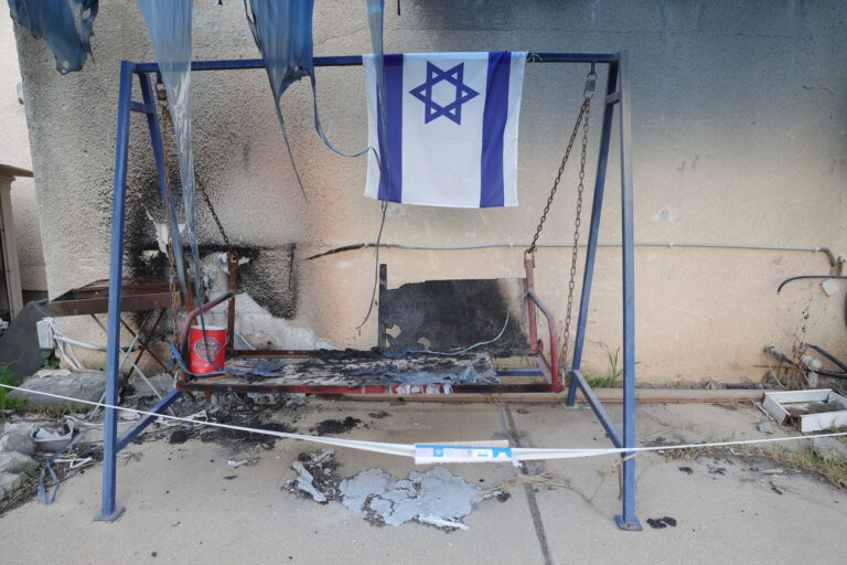epa11944529 An Israeli flag hangs from a burnt swing as family and friends of Israeli hostages, twin brothers Gali and Ziv Berman, gather for a rally outside the brothers' home calling for their release, in kibbutz Kfar Aza, near the border with the Gaza Strip in southern Israel, 06 March 2025