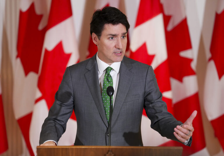 Canada Prime Minister Justin Trudeau holds a press conference at the Canadian embassy in Brussels, Belgium, Wednesday, Feb