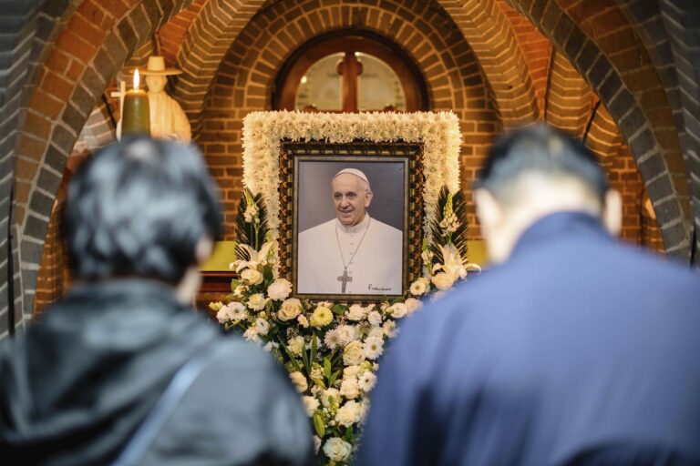 People pay their respects in front of a portrait of late Pope Francis displayed inside Myeongdong Cathedral in Seoul Tuesday, April 22, 2025