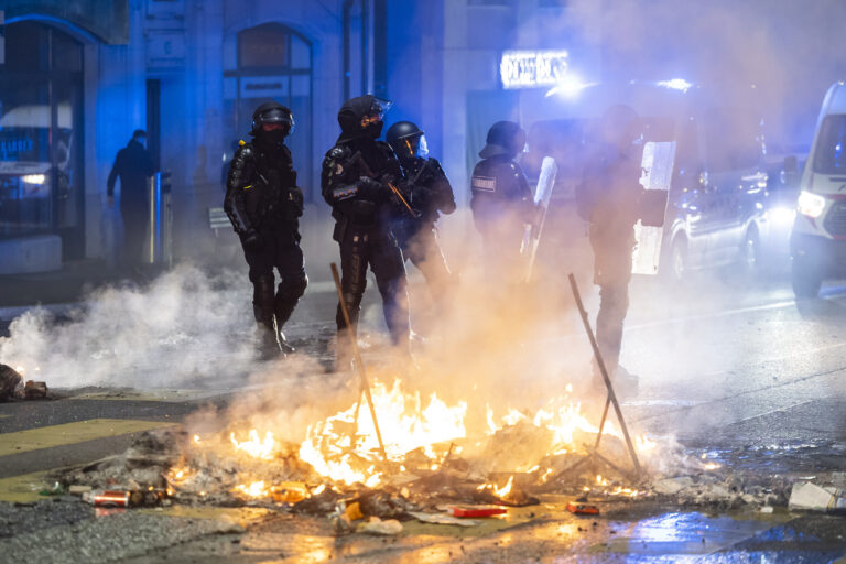 Des policiers interviennent au milieu de l'avenue de Morges (quartier de prelaz) lors de la deuxieme nuit d'emeutes suite a l ...