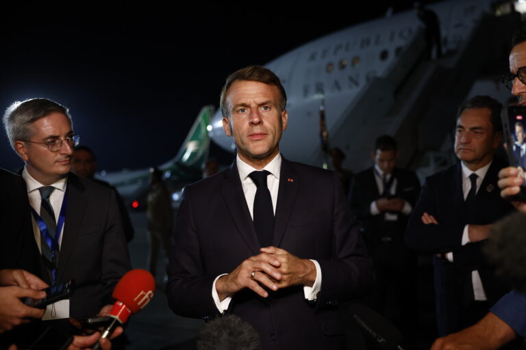 epa12451656 French President Emmanuel Macron answers to journalists as he leaves the Gaza Peace Summitin Sharm El-Sheikh, Egypt, 13 October 2025