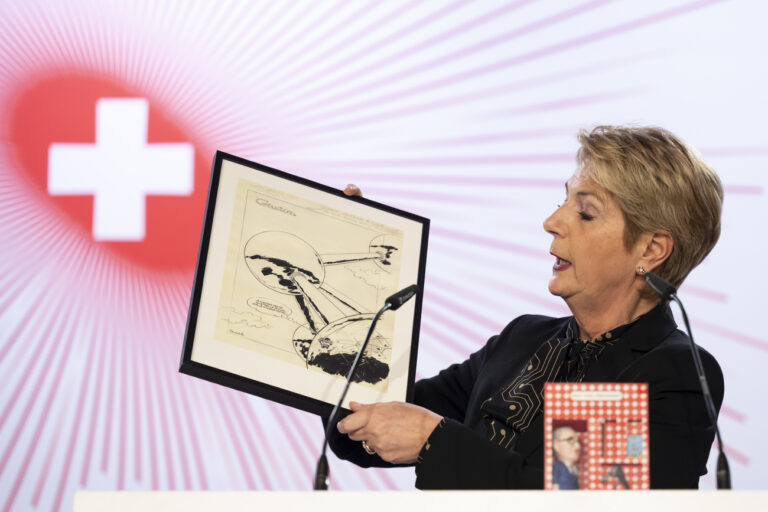 La Presidente de la Confederation Karin Keller-Sutter offre des cadeaux dont une estampe de Gaston Lagaffe au president de la confederation nouvellement elu Guy Parmelin, lors de la celebration de son election a la presidence du Conseil federal, ce jeudi 18 decembre 2025 a l'Ecole hoteliere de Lausanne (EHL), Hospitality Business School, a Lausanne