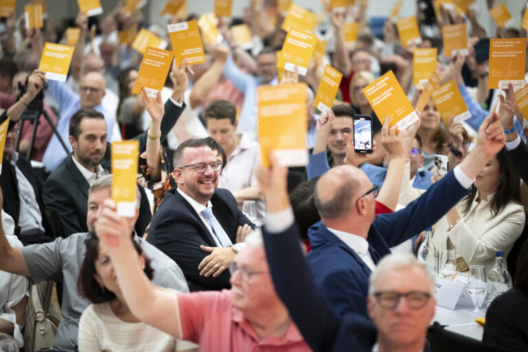 Parteimitglieder stimmen fuer der neu gewaehlte Parteipraesidentpraesident Philipp Matthias Bregy, Nationalrat Mitte-VS, bei der Wahl des neuen Parteipraesidenten, an der Delegiertenversammlung der Mitte Partei, am Samstag, 28