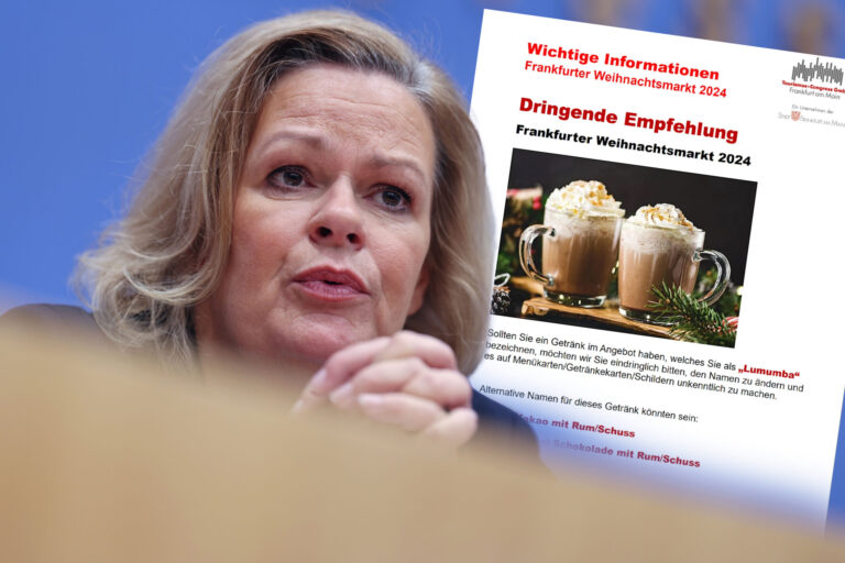 Bislang blieb es bei einer Bitte gegenüber den Veranstaltern, an die sich einige halten und manche nicht. Den Grossteil der Bevölkerung in Deutschland dürften ohnehin andere Probleme auf dem Weihnachtsmarkt umtreiben als der Name eines Getränks. Zum Beispiel die Sicherheitslage in der Bundesrepublik. «Seien Sie wachsam», empfahl vor kurzem Bundesinnenministerin Nancy Faeser im Hinblick auf den Weihnachtsmarktbesuch und meinte damit ganz sicher nicht die politisch korrekte Beschilderung an der Glühweinbude.
