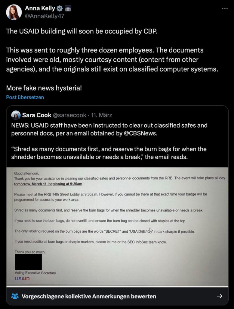 Die offizielle Begründung für die Aktion bleibt unklar. Das Weisse Haus erklärte, das USAID-Gebäude werde bald von der Zoll- und Grenzschutzbehörde CBP übernommen. Laut Sprecherin Anna Kelly handelt es sich nur um alte und formelle Dokumente, deren Originale noch in gesicherten Computersystemen existieren.