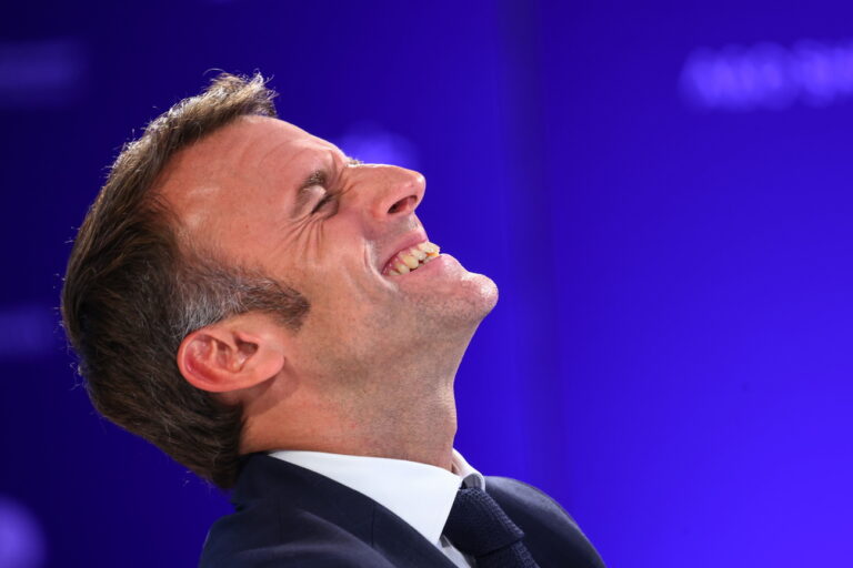 epa11637785 French President Emmanuel Macron laughs as he takes part in a panel discussion during the Berlin Global Dialogue (BGD) summit, in Berlin, Germany, 02 October 2024