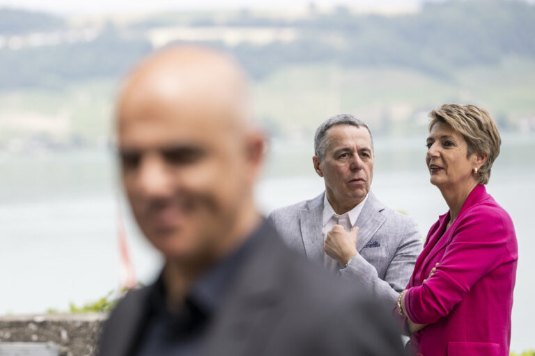 Waehrend Bundespraesident Alain Berset, links, zu Medienvertretern spricht, diskutieren Bundesraetin Karin Keller-Sutter, rechts, und Bundesrat Ignazio Cassis mit dem Murtesee im Hintergrund, am Rand der Bundesratsreise, am Donnerstag, 29