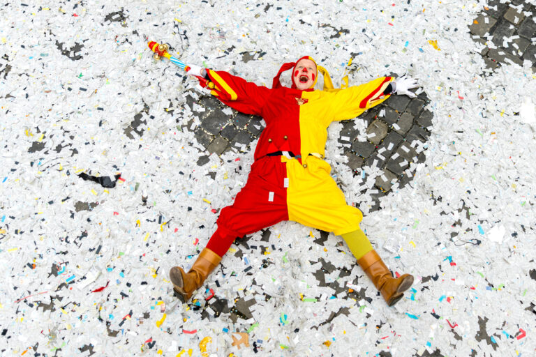 Der Narr der Zunft zu Safran liegt im 'Foetzeliraege' und geniesst die Luzerner Fasnacht am Schmutzigen Donnerstag, 27