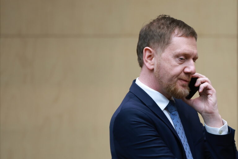 epa11977869 Saxony State Premier Michael Kretschmer talks on a phone during a session of the German Federal Council 'Bundesrat' in Berlin, Germany, 21 March 2025
