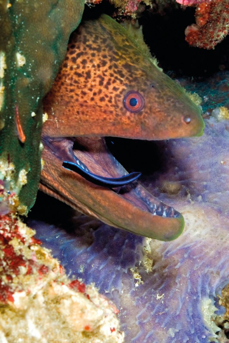 Im Jahr 1954 machte Irenäus Eibl-Eibesfeldt auf Galapagos eine erstaunliche Entdeckung: Beim Tauchen in einem Korallenriff machte er neben einem Felsblock Pause. Ein mächtiger Zackenbarsch ruderte aus der Tiefe herauf und blieb über dem Felsen stehen. Er sperrte das Maul weit auf, als müsste er gähnen, spreizte gleichzeitig die Kiemendeckel und verharrte regungslos. Darauf tänzelten zwei schlanke Lippfische daher, die Körperseiten mit auffallendem Streifenmuster geschmückt. Blau-schwarze Putzertracht: Meerschwalbe und Riesenmuräne. ...