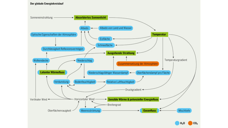 Das war also die Ausgangslage, und sehr schnell erkannte ich, dass das mit dem CO2 nicht stimmte, und ich versuchte, der Sache auf den Grund zu gehen. Je tiefer ich bohrte, desto mehr wurde mir klar, dass da nichts war. Wirklich nichts! Treffend darstellen lässt sich das mit einem Bild von Willie Soon, einem Astrophysiker, der lange in Harvard tätig war, und «Klimarealist» der ersten Stunde. Gezeigt werden da die groben Energieprozesse, die die Energiebilanz der Atmosphäre der Erde bestimmen. Um Ihnen das Zählen zu ersparen: Es sind achtzehn Prozesse, davon siebzehn mit dem Wasserdampf verbunden, und nur ein einziger – nämlich die atmospheric composition – hat entfernt etwas mit dem CO2 zu tun.
