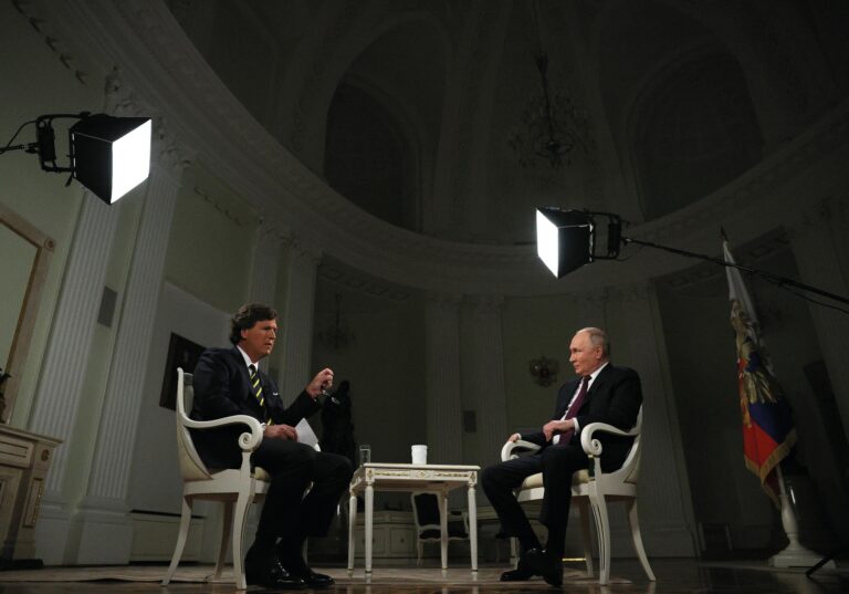 Tucker Carlson: Herr Präsident, ich danke Ihnen. Am 22. Februar 2022 wandten Sie sich in einer landesweiten Ansprache an Ihr Land, als der Konflikt in der Ukraine begann, und Sie sagten, dass Sie handelten, weil Sie zu dem Schluss gekommen waren, dass die Vereinigten Staaten über die Nato einen, ich zitiere, Überraschungsangriff auf unser Land starten könnten. In amerikanischen Ohren klingt das paranoid. Sagen Sie uns, warum Sie glauben, dass die Vereinigten Staaten Russland aus heiterem Himmel angreifen könnten. Wie kamen Sie zu diesem Schluss?