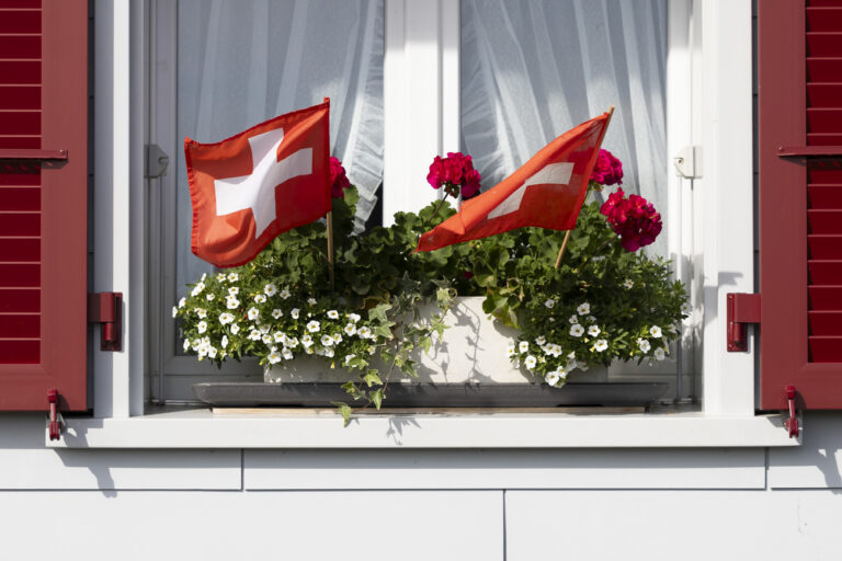 Zwei Schweizer Flaggen wehen in einem Geranientopf auf einem Fensterbrett, am Montag, 31