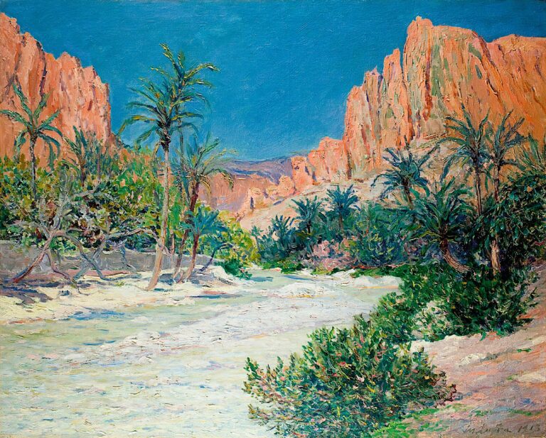 Maxime Maufra, Morning in the Oasis of Alkantra, 1913 – Es dauerte eine Zeit, bis der Franzose Maxime Maufra (1861–1918) seine Oase fand. Er irrte umher auf den Wegen anderer, weil er den Mut für den seinen lange nicht fand. Da war eine Stimme ohne Weg. Seine Eltern schickten ihn nach Liverpool, das Kaufmännische sollte er erlernen, um danach Geschäftsmann zu werden. Er verdiente Geld, nicht viel, nicht wenig, und noch weniger fand er Glück. Maufra war damals Freizeitmaler und Glückssucher, und sein Glück war eine Landschaft, die ihn träumen liess, eine Staffelei und Farbe.