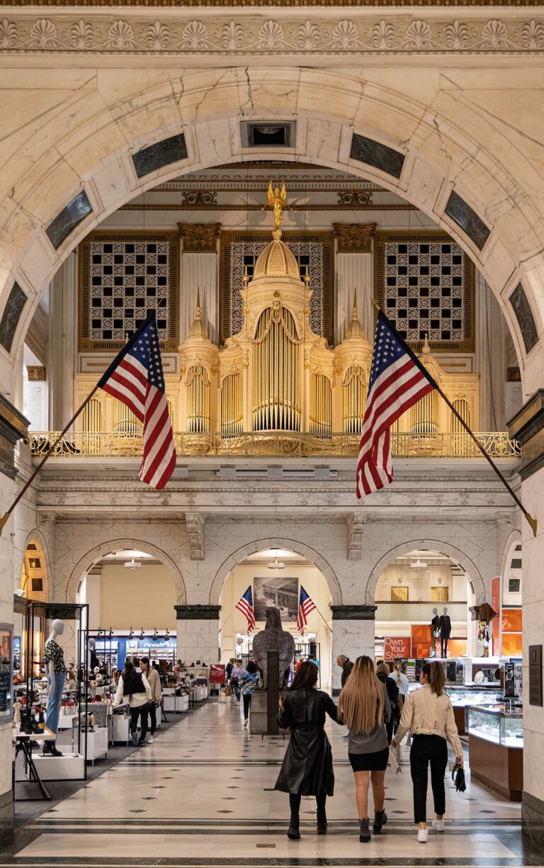 Gut hörbar rumpeln die Schuhschachteln auf den Boden der Great Hall im Macy’s, einem grossen Kaufhaus alter Schule, gleich neben der City Hall von Philadelphia. Eine Kundin auf der Suche nach Fussbekleidung ist ob eines lauten Orgelakkords des Leitmotivs von «Memory» aus Andrew Lloyd Webbers Musical «Cats» offensichtlich derart erschrocken, dass sie einen Stapel von Schachteln umstiess. So gut ist die Akustik im neunstöckigen, von Balustraden und Balkonen gesäumten Innenhof des Warenhauses, dass der Lärm der Kartonschachteln mühelos durch den massiven Klangteppich schneidet. Gewoben wird der Live-Sound von der weltberühmten Wanamaker-Orgel, dem grös ...