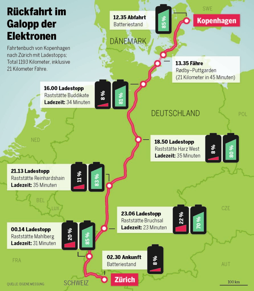 Die Übungsanlage wäre auch in einem herkömmlichen Auto eher ambitioniert: Zürich–Kopenhagen retour innerhalb von 48 Stunden. 1200 Kilometer trennen die Limmatstadt von der dänischen Metropole des guten und umweltbewussten Lebens. Das macht dann 2400 Kilometer. Schlafen muss der Mensch ja auch noch. . . Und er möchte, zumindest ein bisschen, in die touristischen Verlockungen seines Zielorts eintauchen.