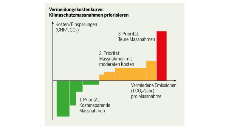 Um diese Kurve zu erstellen, sind Emissionsreduktionsmassnahmen bezüglich Machbarkeit, Kosten und Reduktionspotenzial zu bewerten. Daraus ergibt sich für jede Firma eine eigene Kostenkurve. Auf Basis dieser Kurve lassen sich drei Prioritäten unterscheiden.