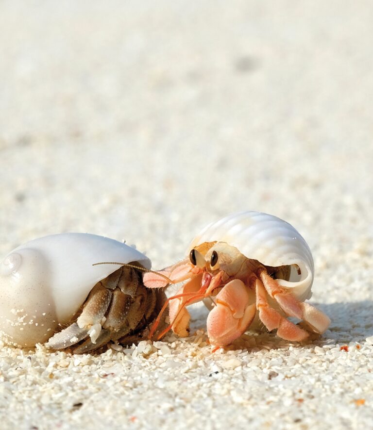 Eine Woge hat das Haus einer prächtigen Wellhornschnecke an den Strand gespült. Bald schon huscht ein Einsiedlerkrebs über den Sand. Seine sechs Laufbeine bewegen sich flink; die restlichen vier Beine und sein Körperhinterteil stecken in einem leeren Schneckenhaus. Das fremde Kalkgehäuse dient dem Krebs als Schutzpanzer und wird auch auf der Futtersuche mitgeschleppt. Mit den Antennen und den Scheren inspiziert der Krebs nun das angeschwemmte Haus. Als er erkennt, dass es leer ist und mehr Platz bietet als der bisherige Container am Hinterteil, verlässt er rasch die alte Stube und schlüpft ins grössere Haus.