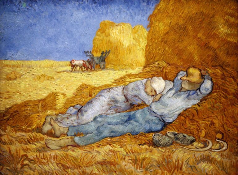 Vincent van Gogh, La Méridienne (Die Siesta), 1890 – Die sechste Stunde, die sexta hora des Tages war lange jene, in der der Tag kurz wieder zur Nacht wurde. Die Menschen legten sich zur Ruhe, suchten Schutz im Schatten und im Schlaf. Wie still stand die Welt, für eine Stunde vielleicht, bevor der Mensch auf ihr fortfuhr, sie sich Tag für Tag untertan zu machen.
